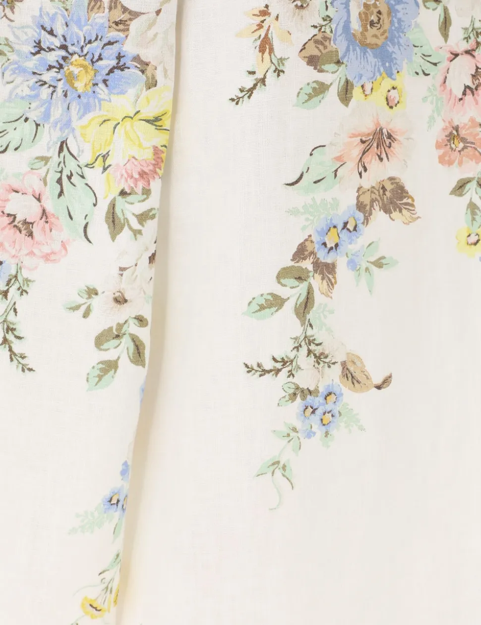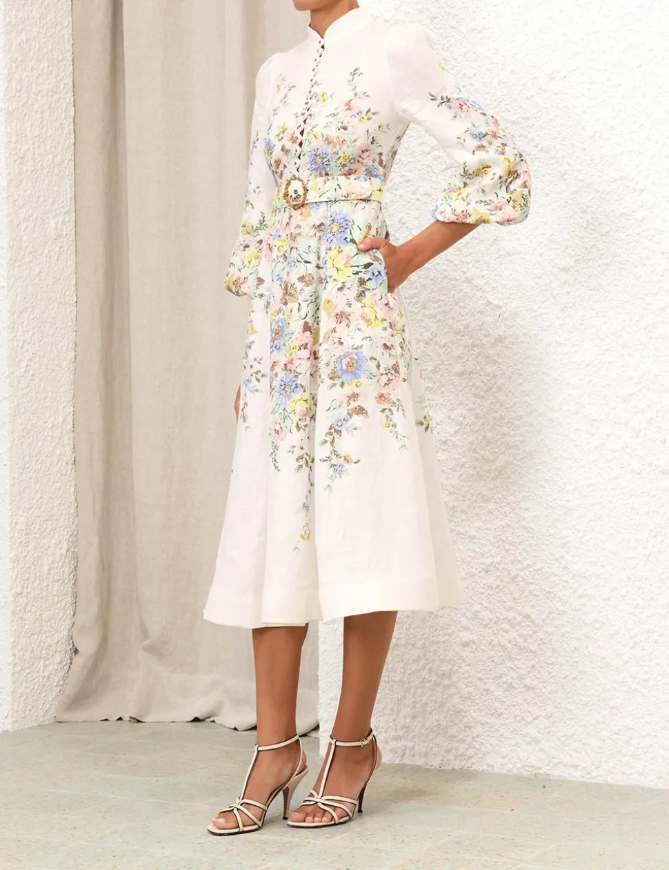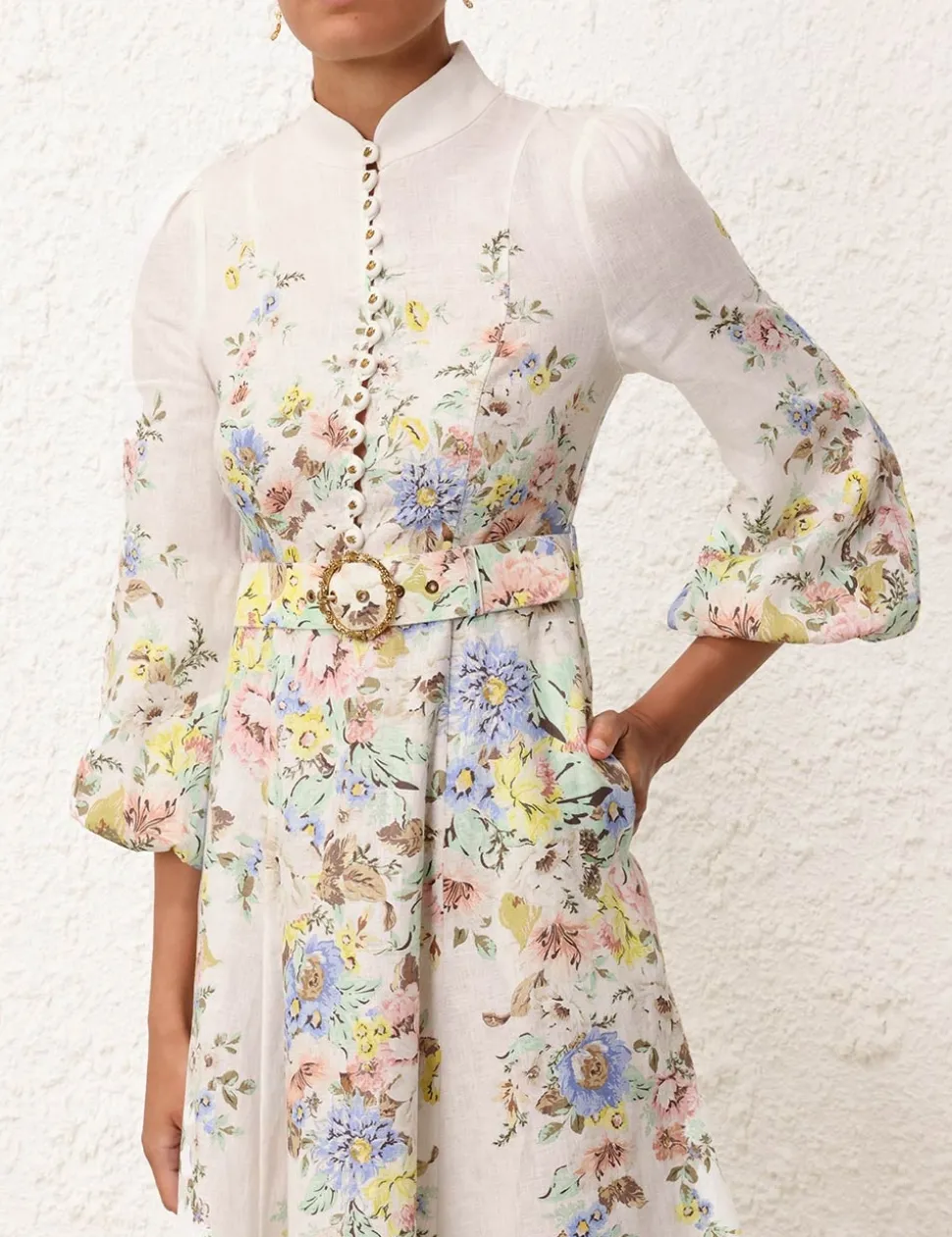 The Matchmaker Buttoned Midi Dress In Cream/Blue Floral From Our Resort 2024 Collection, Matchmaker. A Linen Midi Dress Featuring A Stand Collar And Exaggerated Sleeves.- Linen Midi Dress