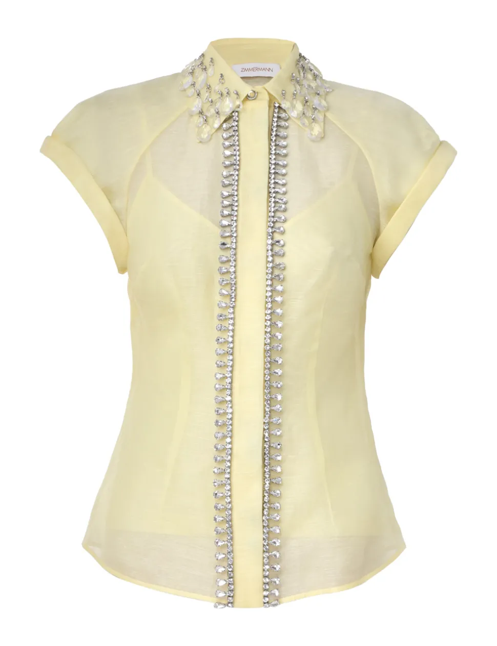 The Matchmaker Diamante Blouse In Lemon From Our Resort 2024 Collection, Matchmaker. A Silk Linen Blouse Featuring Cuffed Sleeves And Crystal Trims Throughout.- Silk Linen Blouse