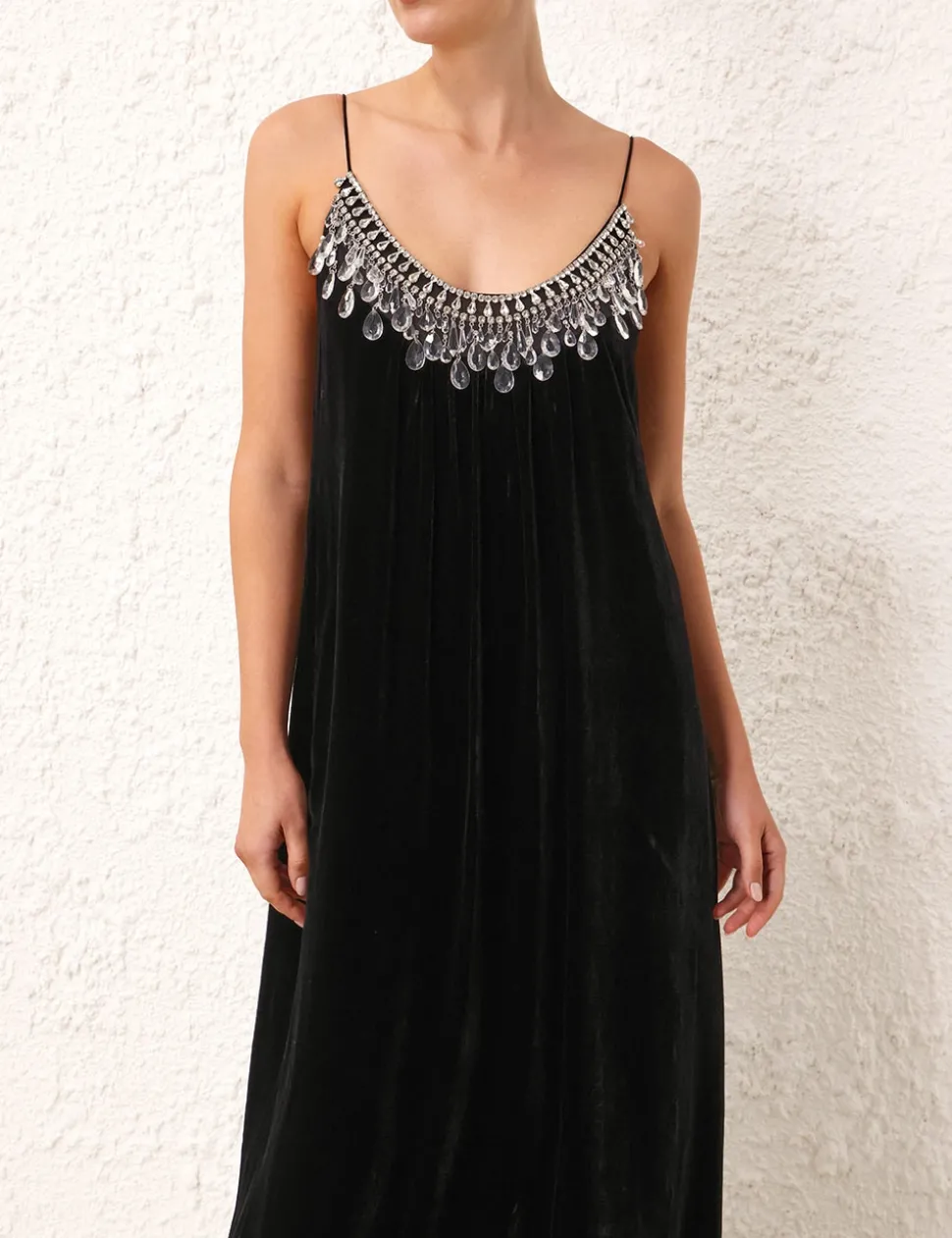 The Matchmaker Diamante Slip Dress In Black From Our Resort 2024 Collection, Matchmaker. A Velvet Slip Dress Featuring Rouleau Straps And A Diamante Crystal Trim Along The Neckline.- Velvet Slip Dress