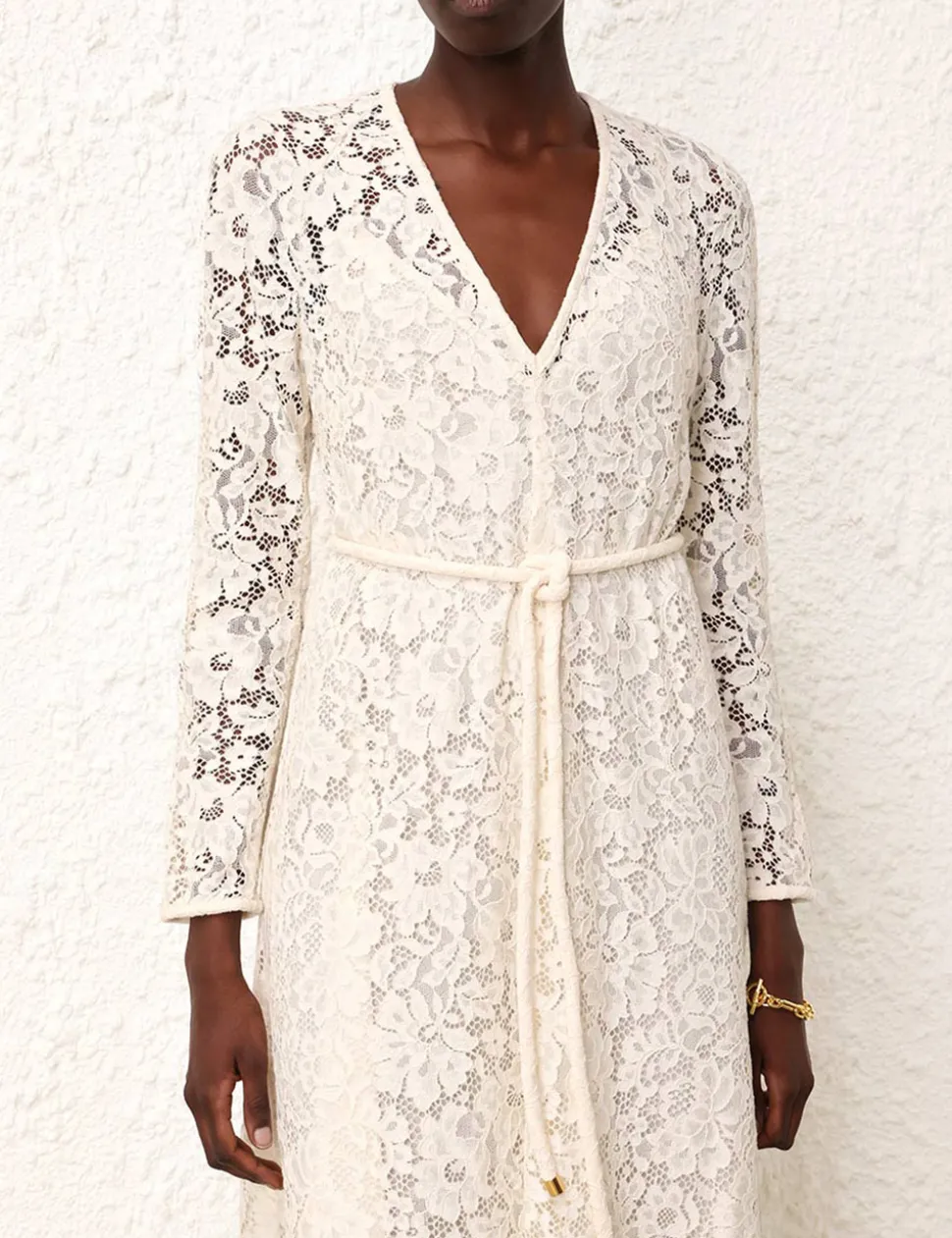 The Matchmaker Lace Sheath Dress In Cream From Our Resort 2024 Collection, Matchmaker. A Lace Long Dress Featuring Corded Piping, And A Tubular Belt.- Lace Midi Dress