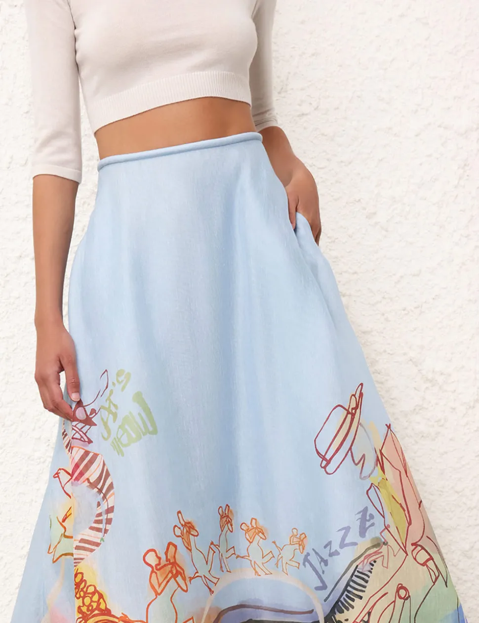 The Matchmaker Poster Flare Skirt In Poster Print From Our Resort 2024 Collection, Matchmaker. A Silk Linen Organza Skirt Featuring A Placement Print Piped Edges Throughout.- Silk Linen Organza