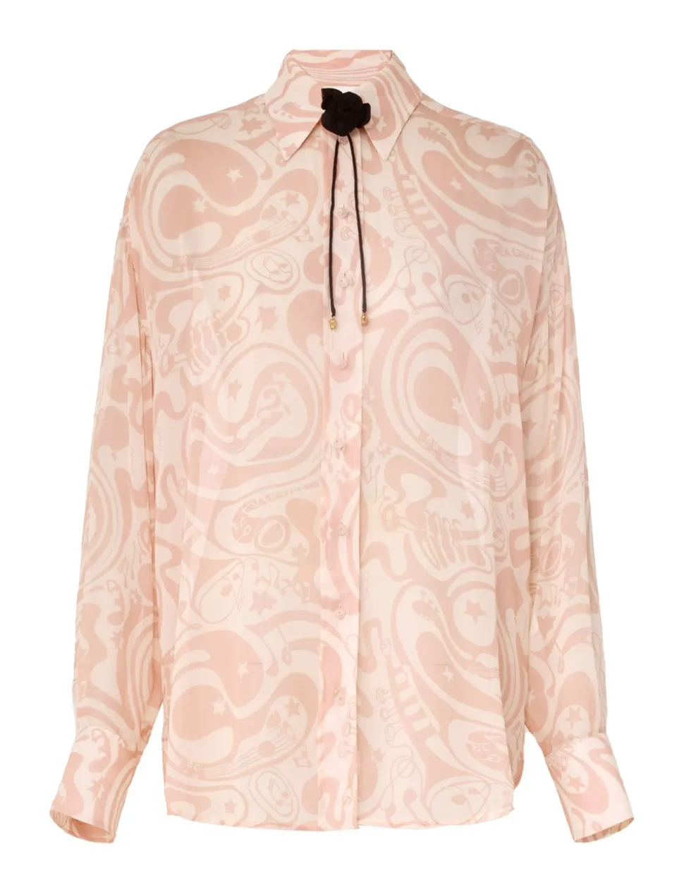 The Matchmaker Relaxed Shirt In Pink/Cream Abstract Musical From Our Resort 2024 Collection, Matchmaker. A Georgette Shirt Featuring A Classic Silhouette, Buttons Down The Centre Front And A 3D Moulded Flower Tie.- Georgette Shirt
