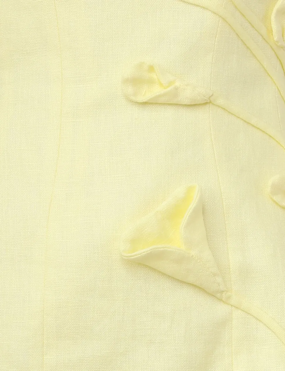 The Matchmaker Rose Mini In Lemon From Our Resort 2024 Collection, Matchmaker. A Linen Mini Dress Featuring Piped Edges And An Asymmetric Hem, Finished With Applique Roses Throughout.- Linen Mini Dress