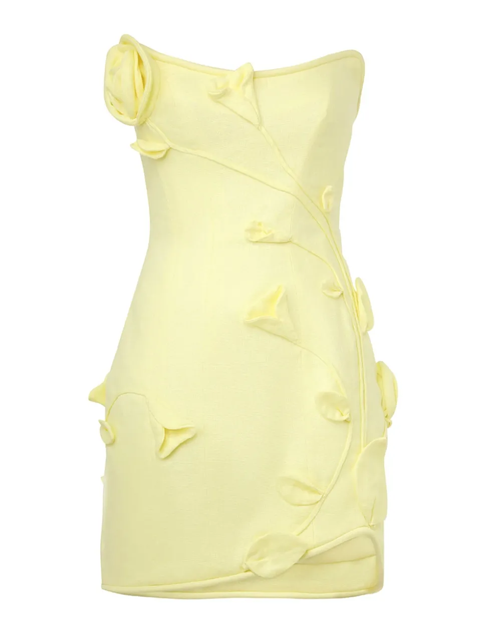 The Matchmaker Rose Mini In Lemon From Our Resort 2024 Collection, Matchmaker. A Linen Mini Dress Featuring Piped Edges And An Asymmetric Hem, Finished With Applique Roses Throughout.- Linen Mini Dress