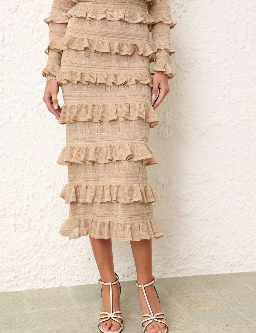 The Lurex Ruffle Midi Skirt In Gold Lurex From Our Resort 2024 Collection, Matchmaker. A Lurex Knit Midi Skirt Featuring An Elastic Waistband And Tiered Ruffle Details Throughout.- Knit Skirt