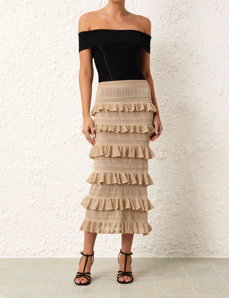 The Lurex Ruffle Midi Skirt In Gold Lurex From Our Resort 2024 Collection, Matchmaker. A Lurex Knit Midi Skirt Featuring An Elastic Waistband And Tiered Ruffle Details Throughout.- Knit Skirt