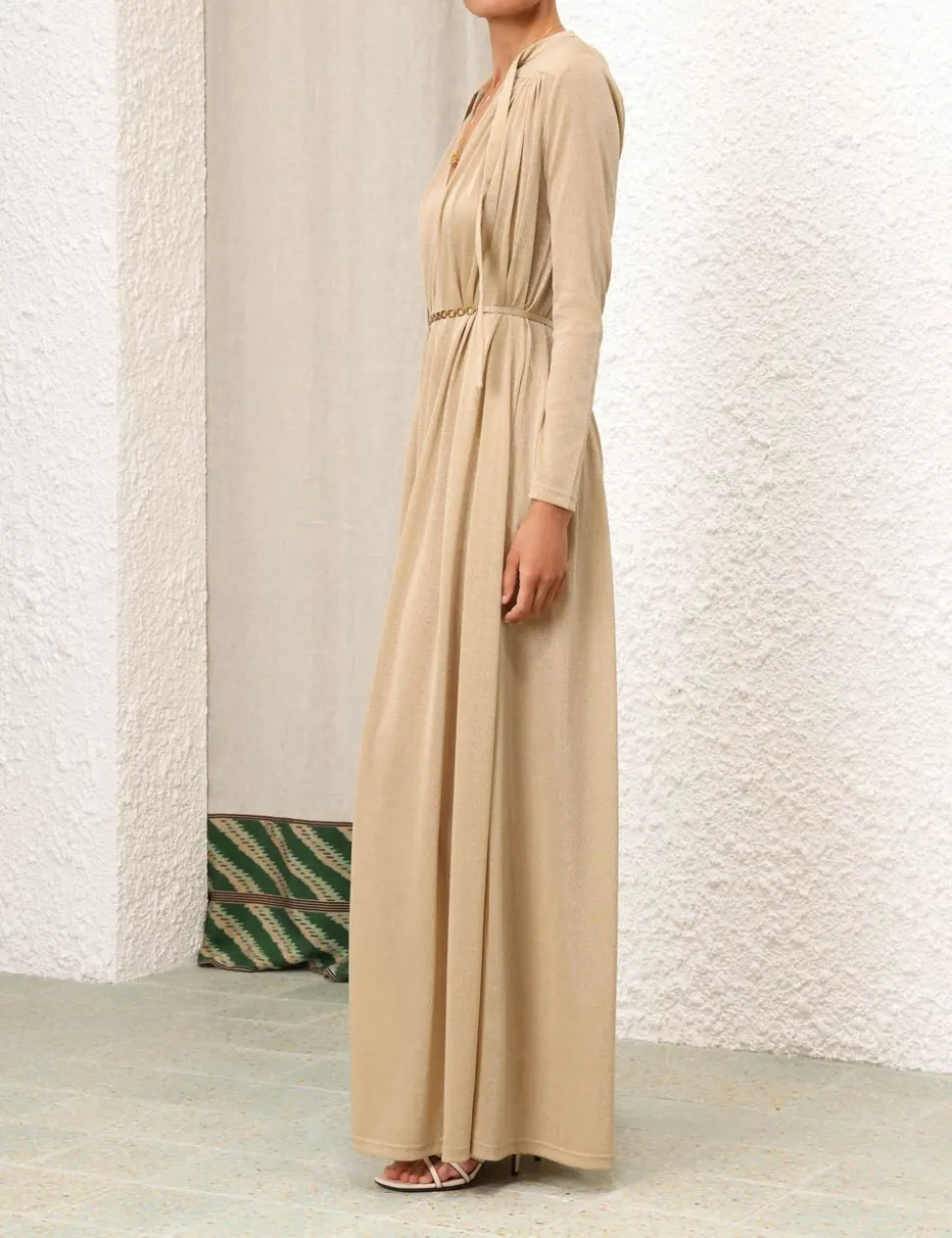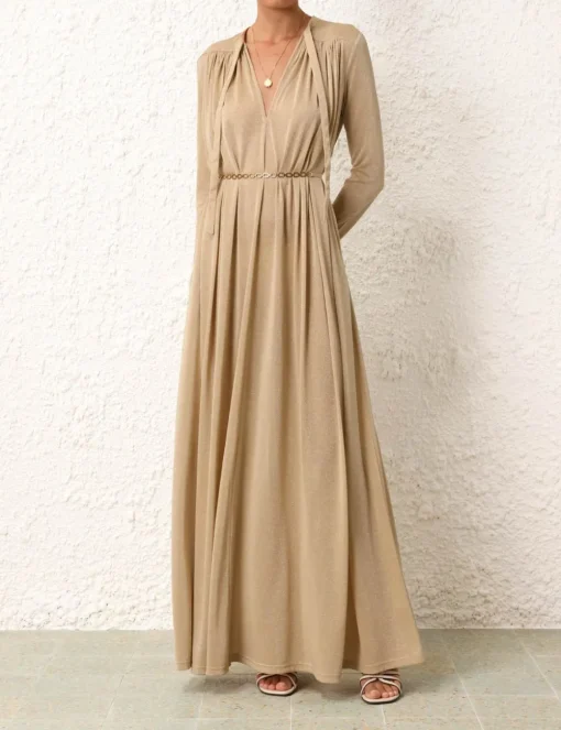 The Matchmaker Smock Dress In Gold From Our Resort 2024 Collection, Matchmaker. A Long Sleeved Maxi Dress Featuring A Deep V Neckline And Metallic Finish.- Lurex Maxi Dress
