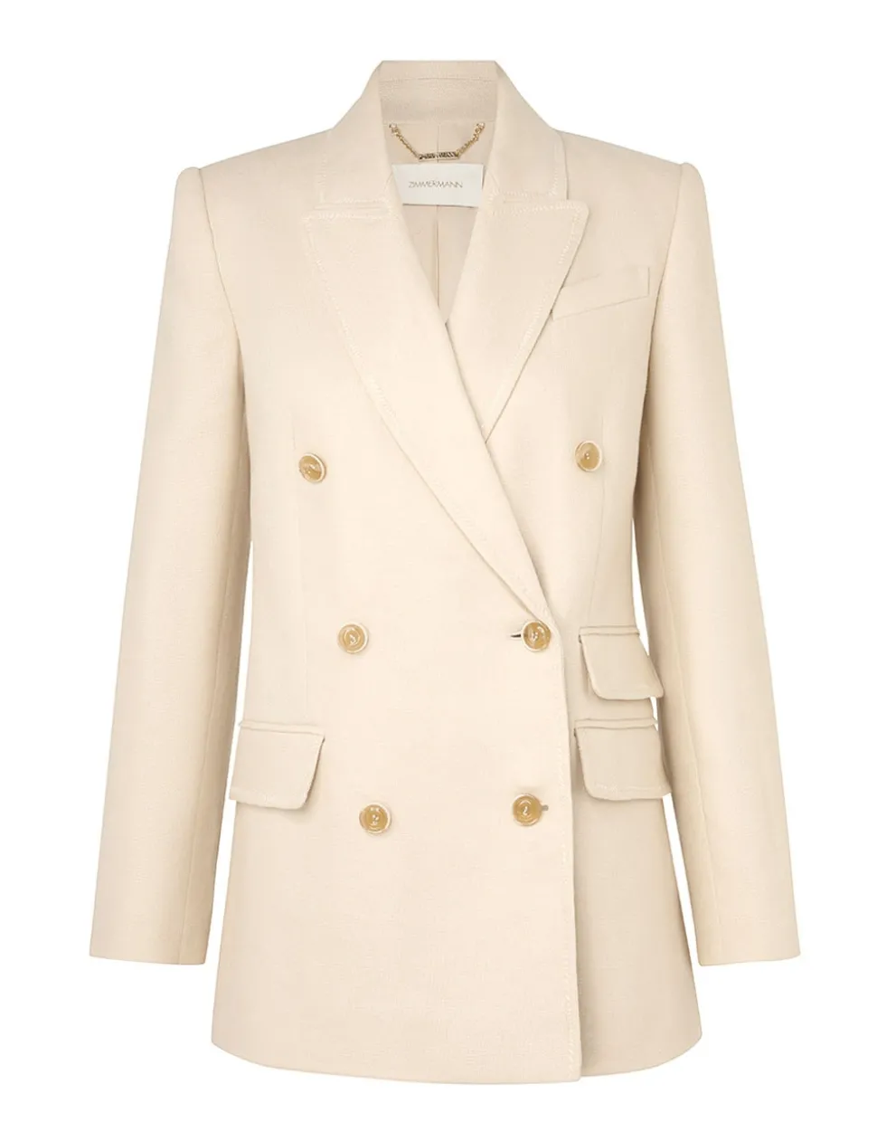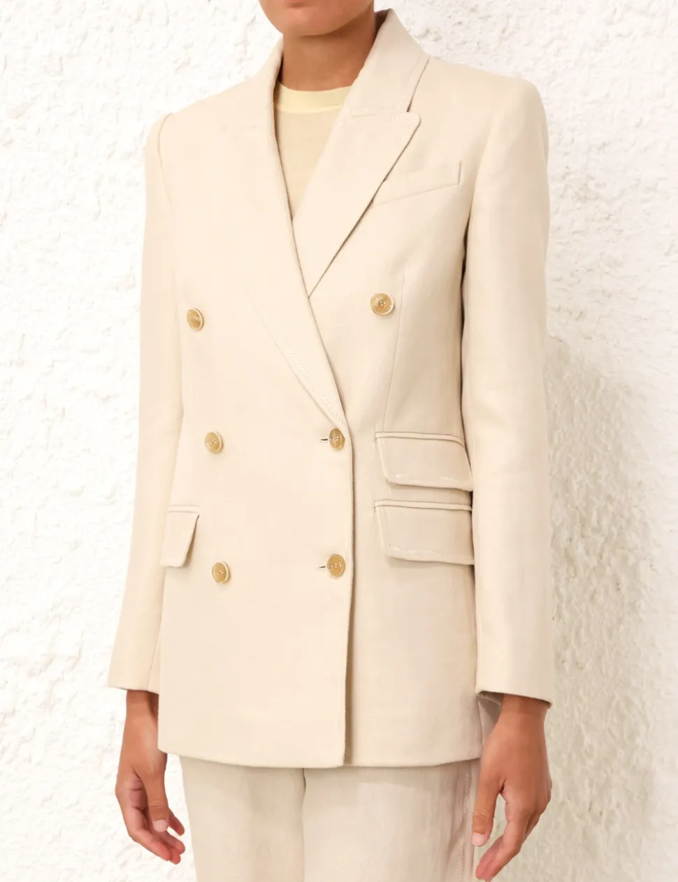 The Matchmaker Tailored Jacket In Straw From Our Resort 2024 Collection, Matchmaker. A Linen Blazer Featuring Zig Zag Top Stitching Throughout, Functional Pockets With Jets, And Buttons At The Front Opening.- Linen Blazer