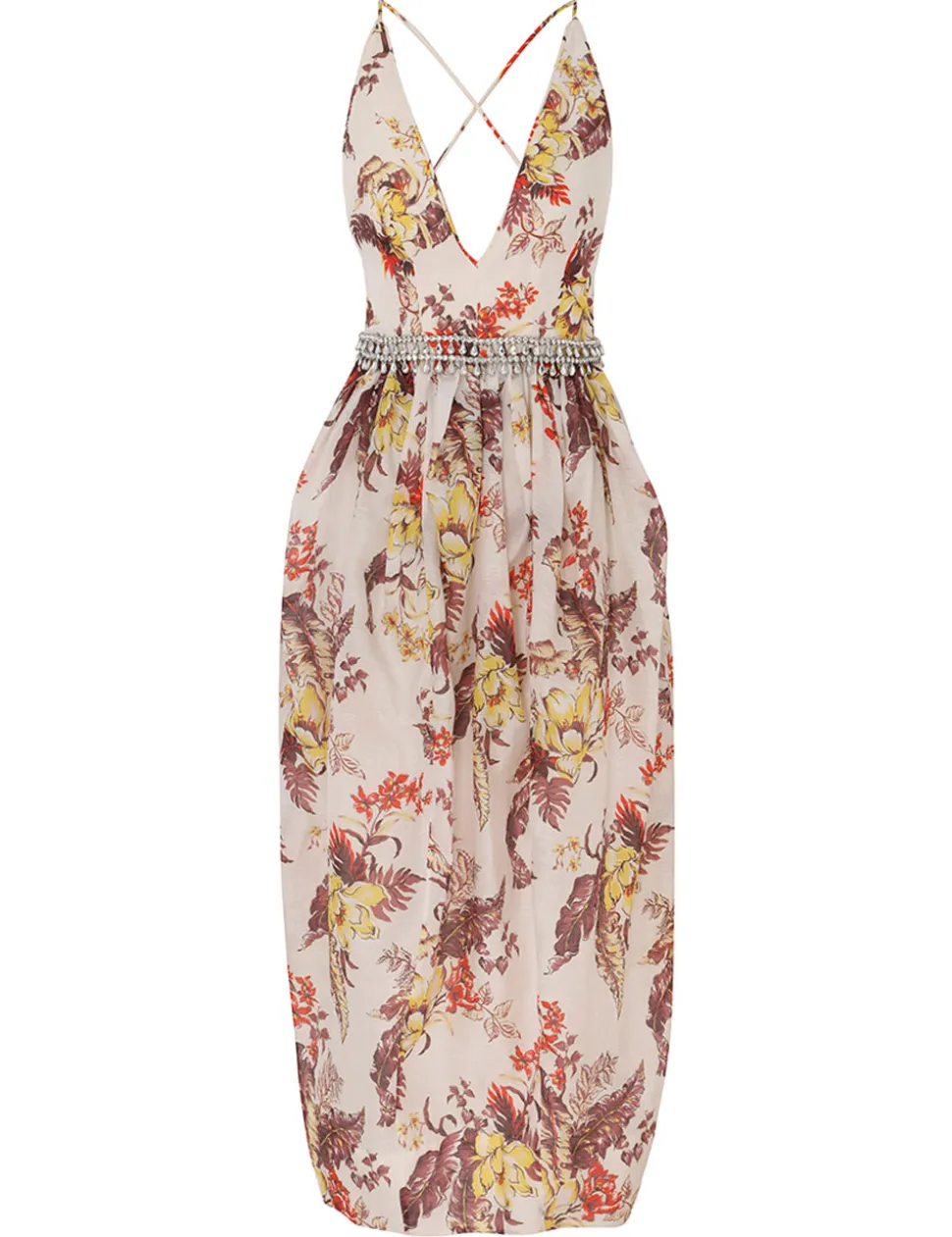 The Matchmaker Tulip Dress Ivory Tropical Floral From Our Resort 2024 Collection, Matchmaker. A Silk Linen Organza Midi Dress Featuring A Tulip Silhouette And Crystal Trims Along The Waist.- Silk Linen Midi Dress