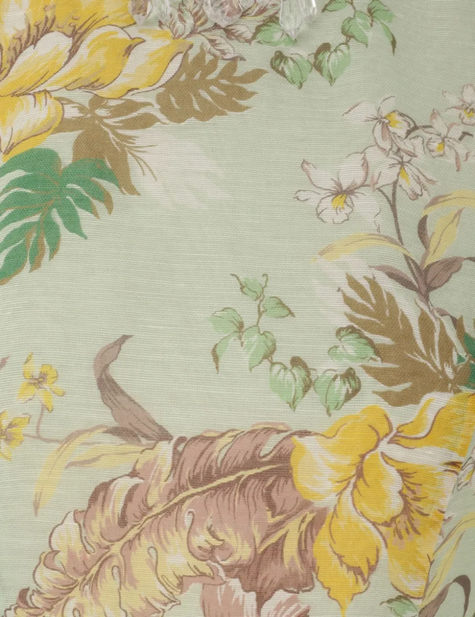 The Matchmaker Tulip Mini Dress In Mint Tropical Floral From Our Resort 2024 Collection, Matchmaker. A Silk Linen Dress Featuring Long Sleeves And A Full Mini Skirt, Finished With A Crystal Trim Along The Neckline.- Silk Linen Mini Dress
