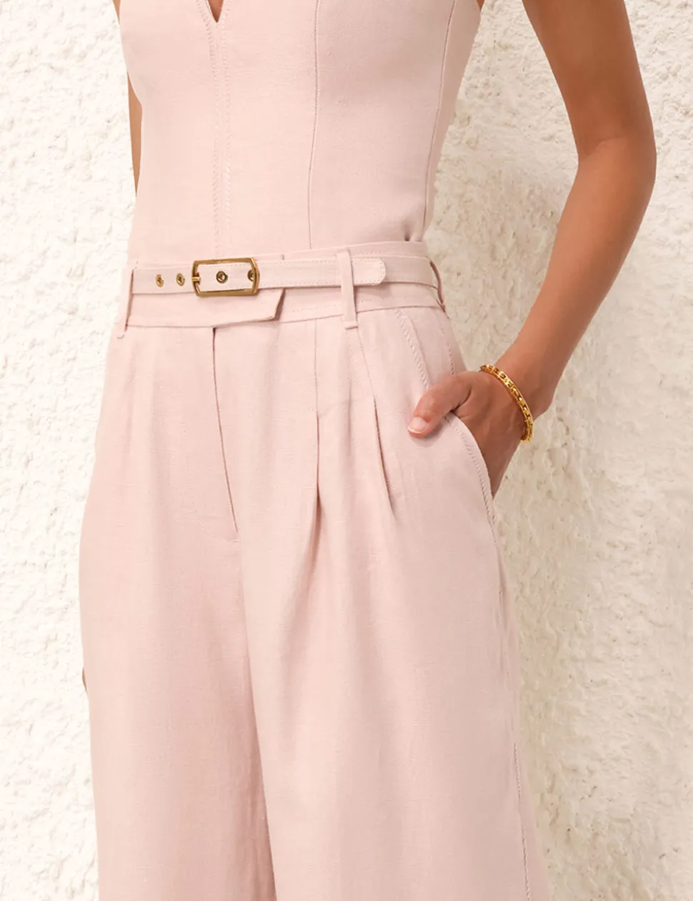 The Matchmaker Wide Leg Pant In Blush From Our Resort 2024 Collection, Matchmaker. A Linen Wide Leg Pant Featuring Side Seam Pockets.- Linen Wide Leg Pant