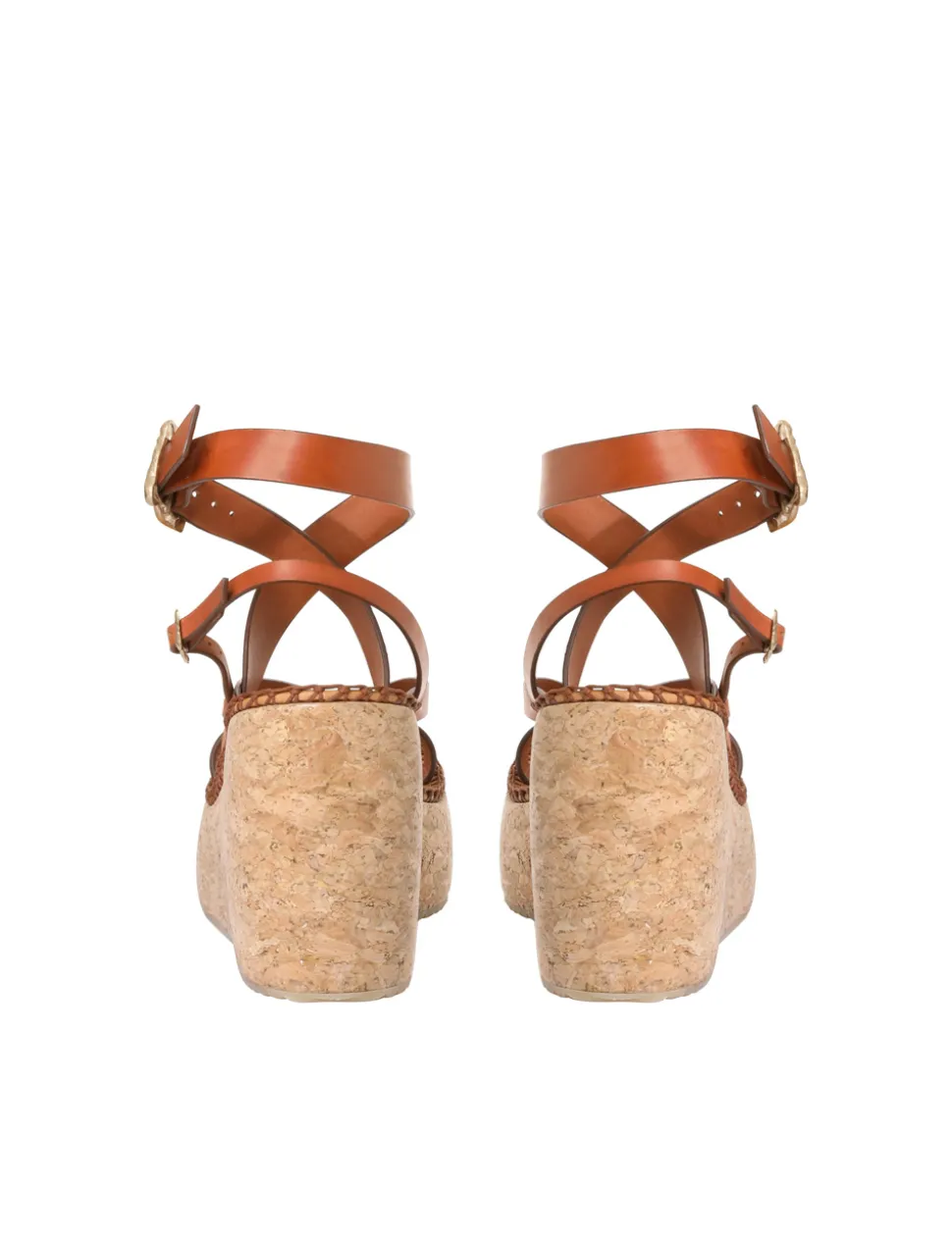 The Multi-Strap Sandal Wedge In Brandy From Our Summer Swim 2023 Collection. A Wedge Heel Featuring Contrast Artisan Stitching And A Wave Buckle Detail.- Made In Italy