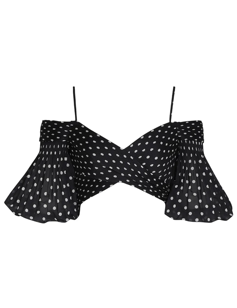 The Pleated Bodice In Black/Cream Dot From Our Fall 2023 Collection, Luminosity. A Cropped Bodice Featuring A Wrap Look Front And Short Blouson Sleeves, Finished With Pleats Throughout.- Pleated Bodice