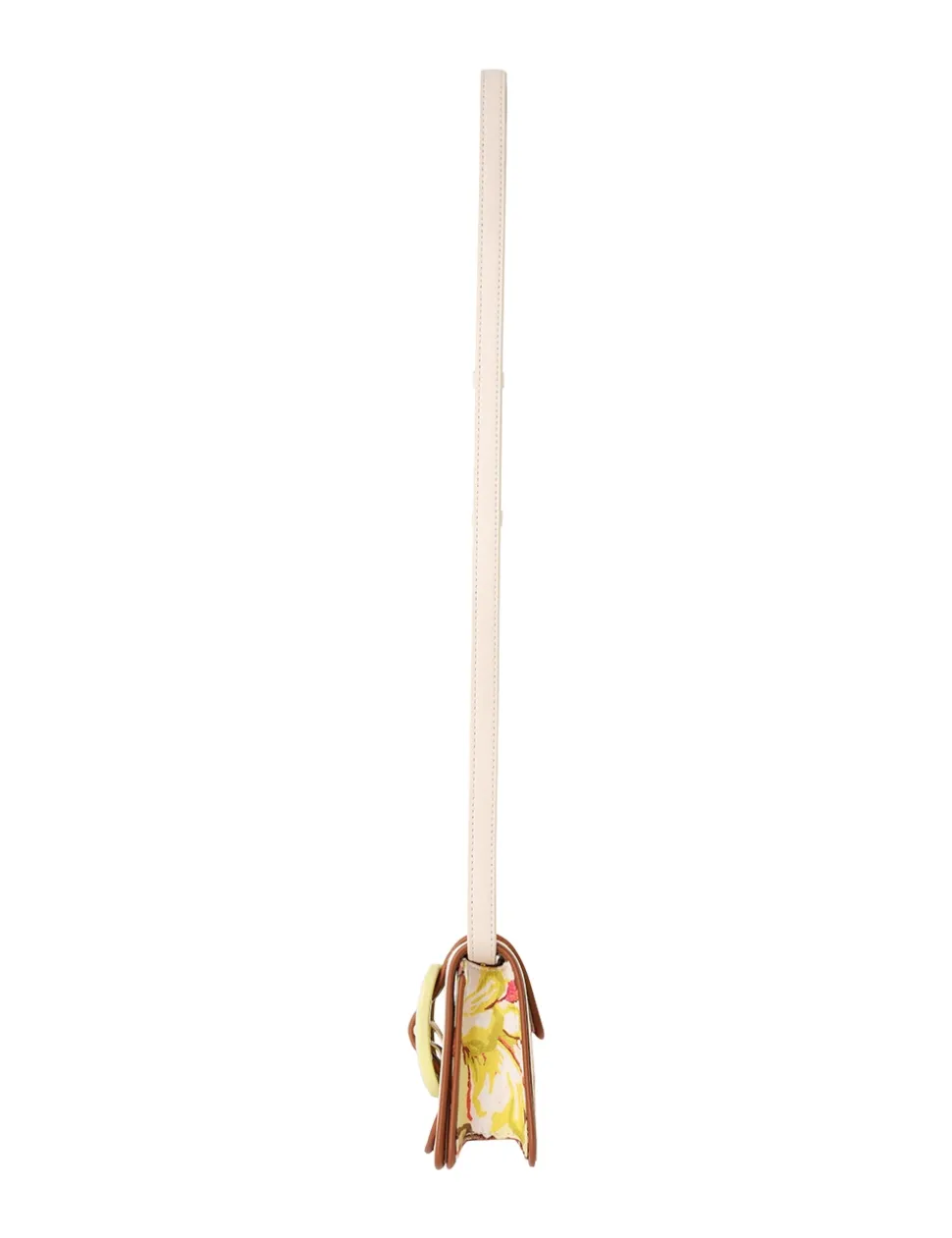 The Printed Small Cross Body Bag In Yellow Hibiscus From Our Resort 2024 Collection, Matchmaker. A Small Linen Cross Body Bag Featuring A Buckle Front Design And An Internal Card Pocket.- Linen Cross Body Bag