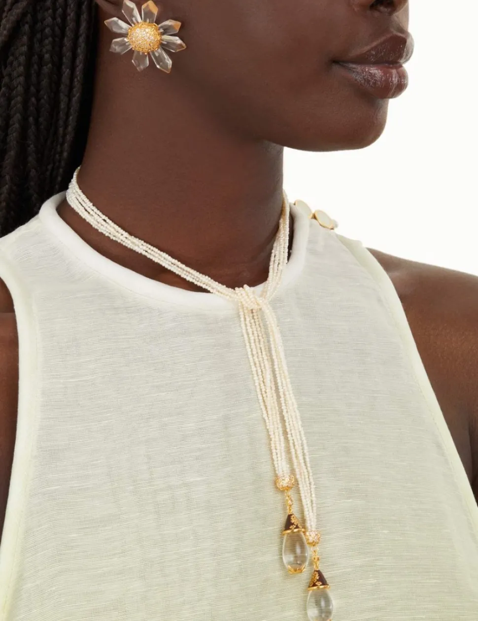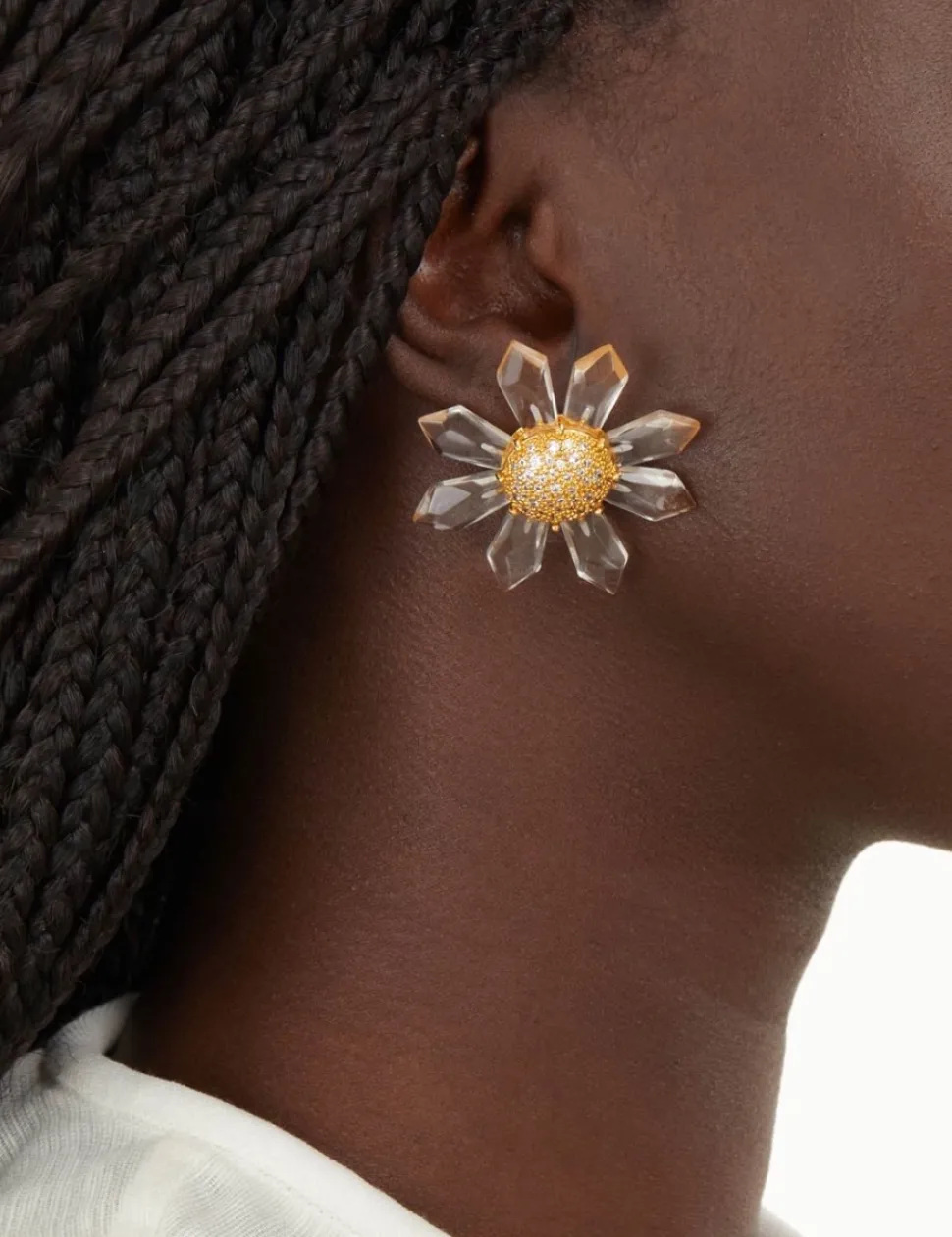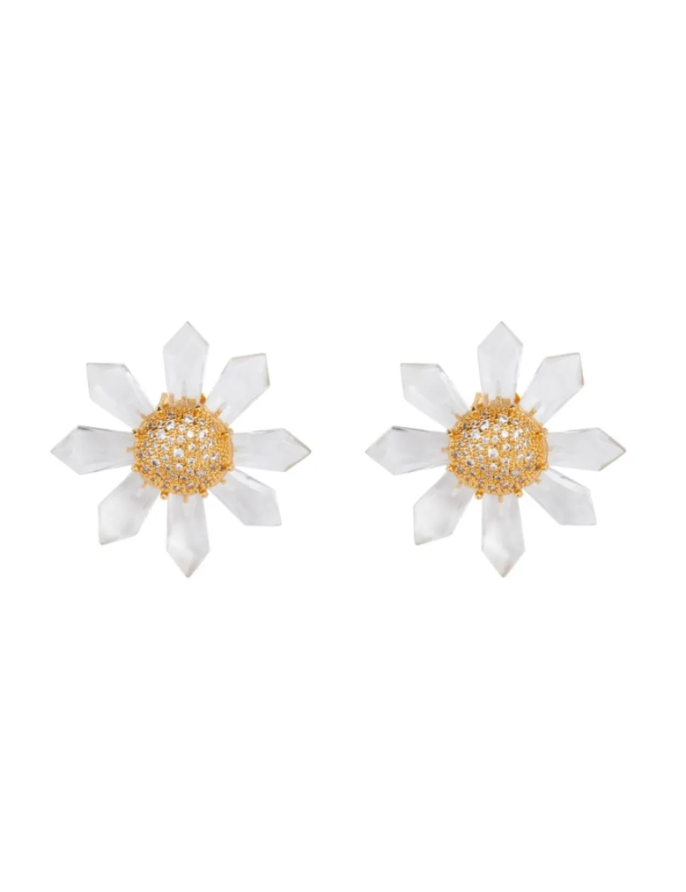 The Quartz Sunflower Earrings In Gold/Quartz From Our Spring 2023 Collection, Wonderland. Gold Plated Sunflower Shaped Earrings Featuring Cubic Zirconia Stones And Natural Quartz.- 20K Gold Plated
