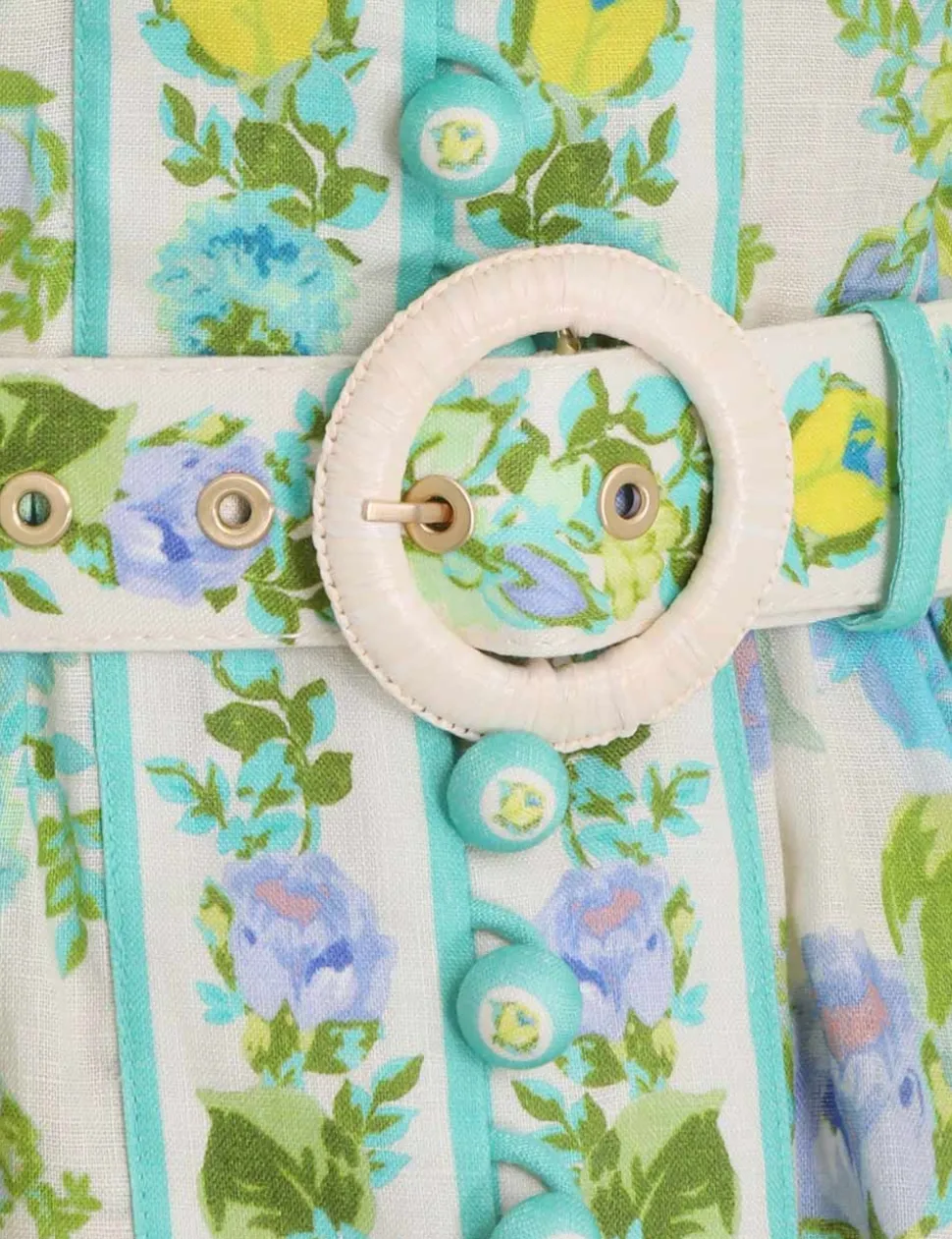 The Raie Buttoned Mini Dress In Teal / Blue Floralfrom Our Summer Swim 2023 Collection. A Linen Belted Mini Dress Featuring Placement Print Throughout, A Raffia Trim, Buttons Down Centre Front And A Blouson Sleeve.- Linen Mini Dress