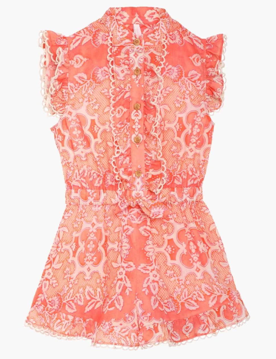 The Raie Frill Playsuit In Coral Pink Damaskfrom Our Summer Swim 2023 Collection. A Cotton Playsuit Featuring A Drawstring Waist, Frilled Sleeves And Hems And Scalloped Edging Throughout.- Cotton