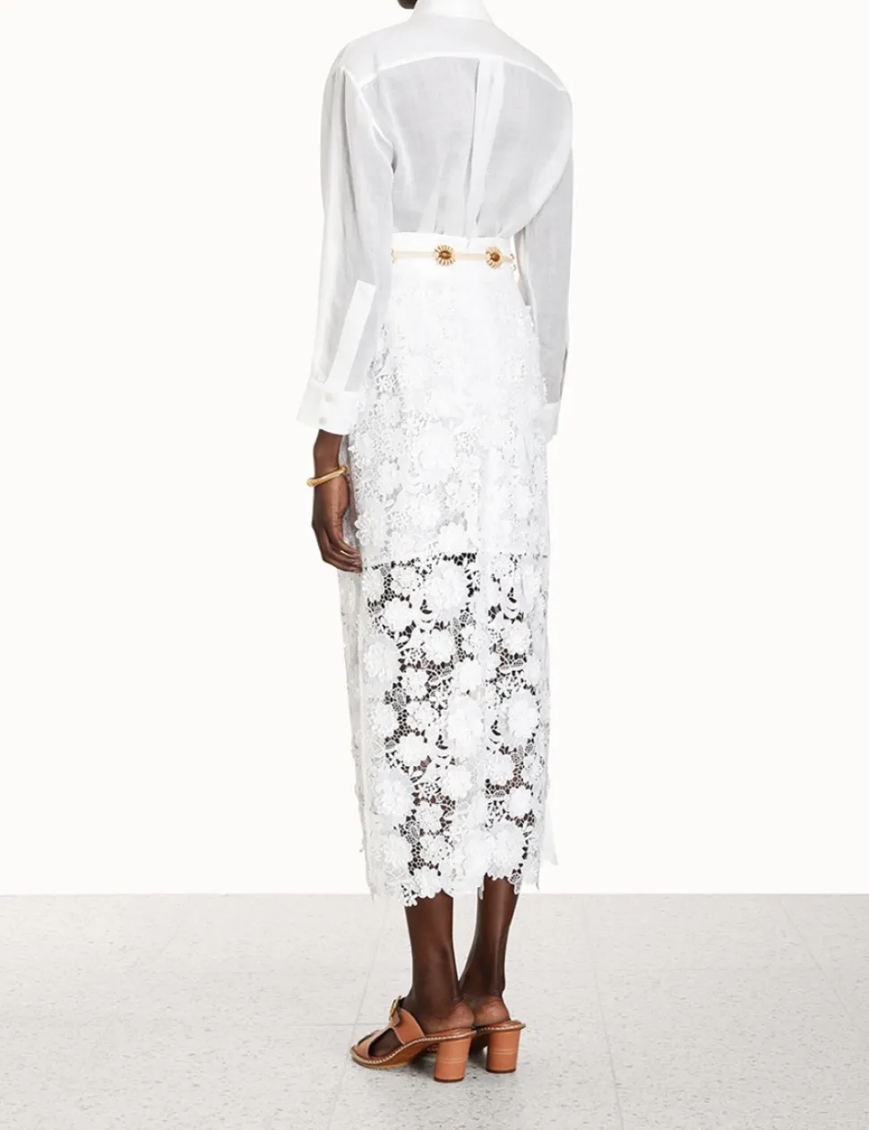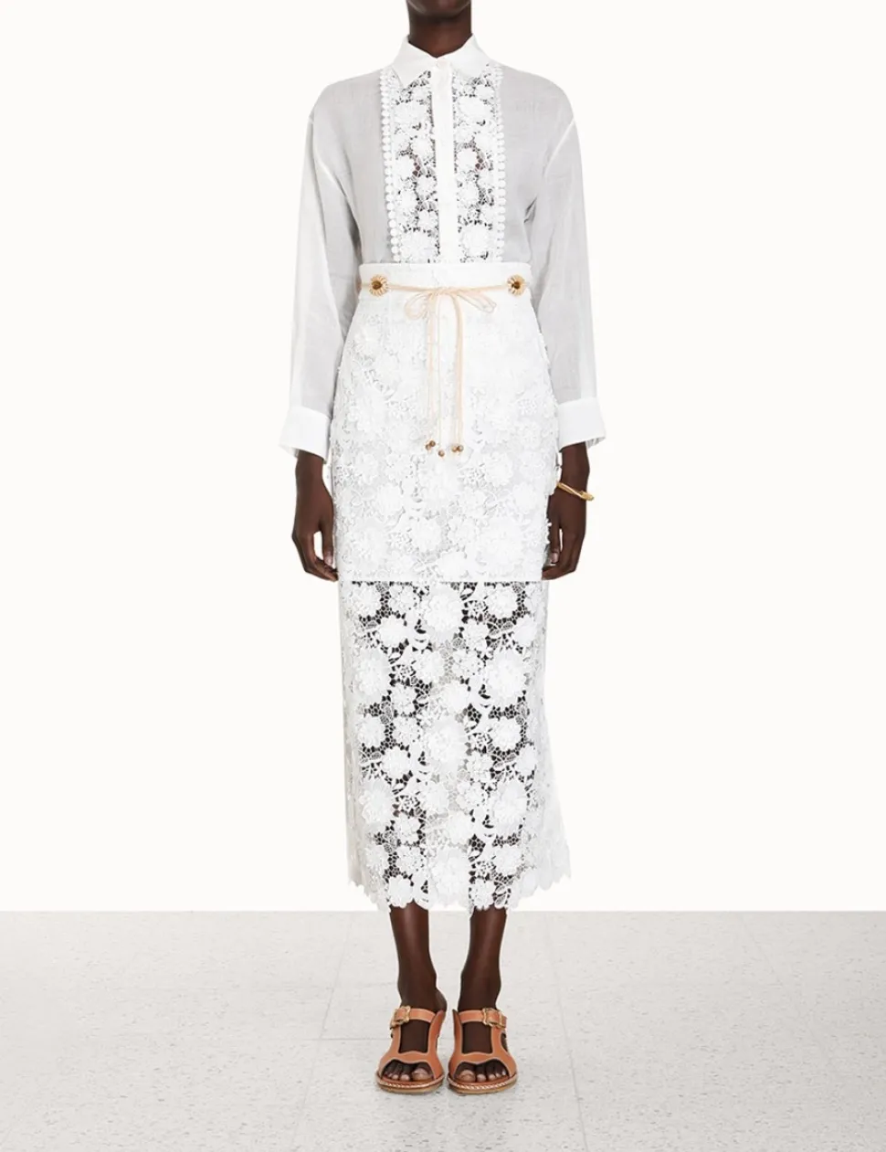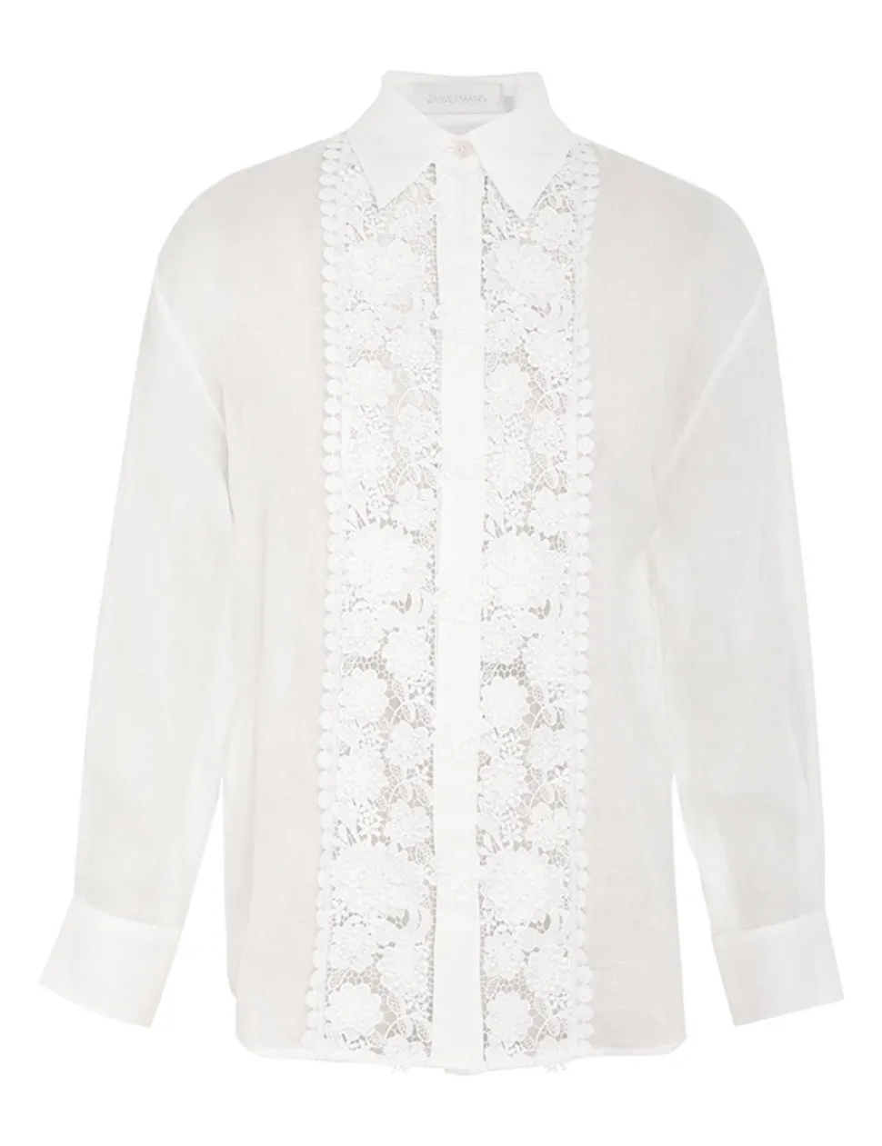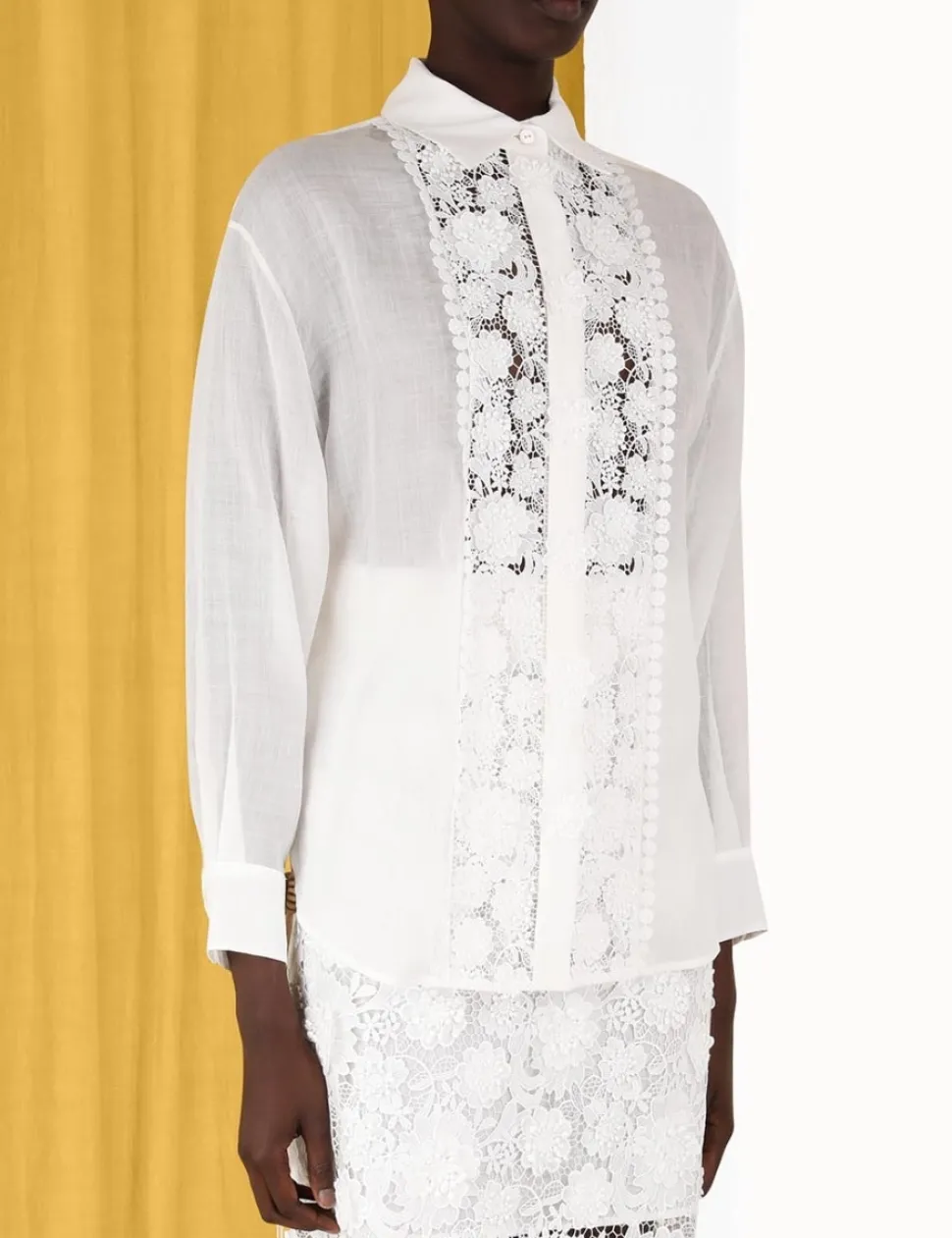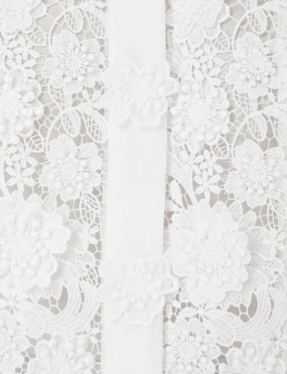 The Raie Lace Flower Shirt In Ivory From Our Summer Swim 2023 Collection. A Ramie Long Sleeve Shirt Featuring A 3D Flower Insert Lace Trim.- Ramie Long Sleeve Shirt