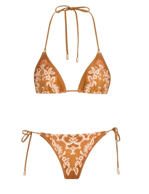 The Raie Placement Mini Tri In Brown Damask From Our Summer Swim 2023 Collection. Spliced Italian Lycra Bikini Featuring A Triangle Top And Low Cut Pants With Self Tie Straps.- Italian Lycra