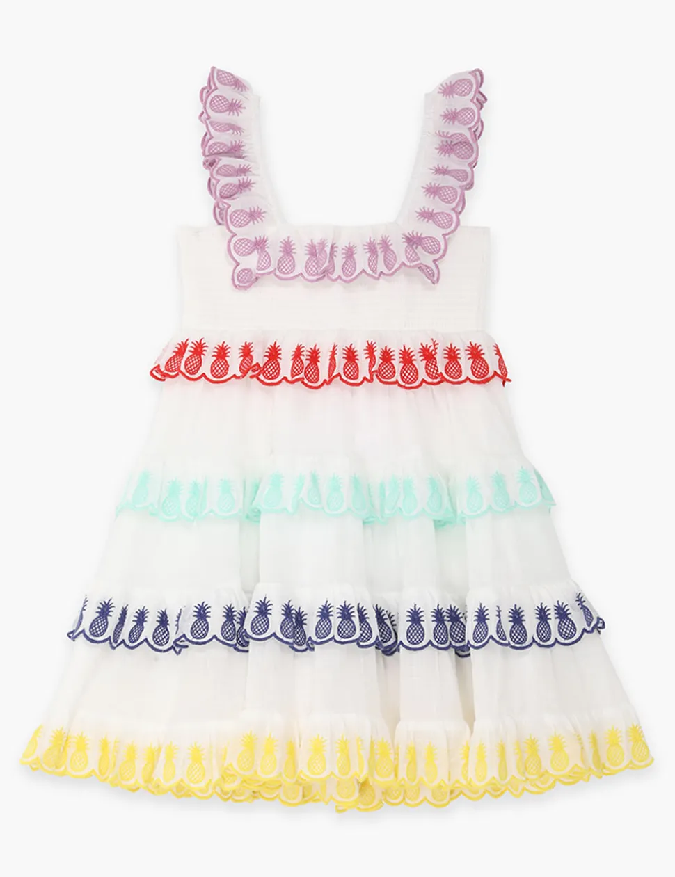 The Raie Shirred Picnic Dress In Multi From Our Summer Swim 2023 Collection. A Cotton Dress Featuring A Multi Coloured Pineapple Trim And A Shirred Bodice.- Cotton Dress