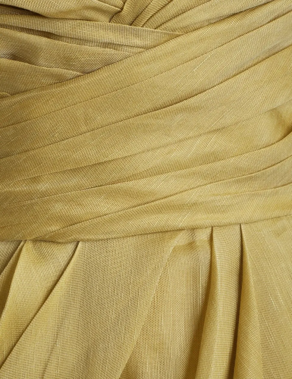 The Sensory Drape Midi Dress In Olive From Our Fall 2023 Collection, Luminosity. A Silk Linen Strapless Dress Featuring An Off Shoulder, Long Sleeve Bodice With A Plunge Neckline, Finished With An Asymmetric Draped Skirt.- Silk Linen Midi Dress
