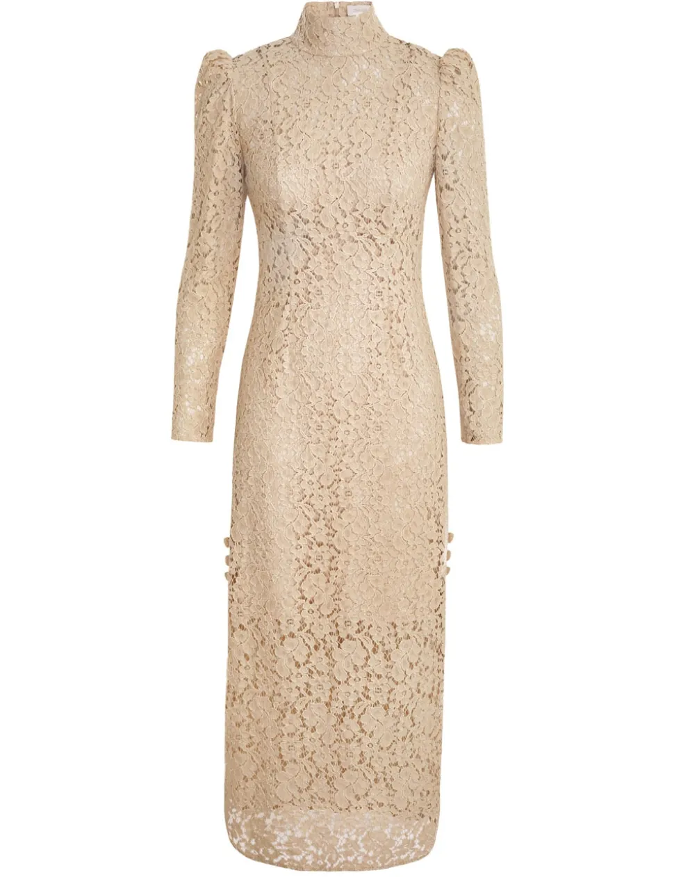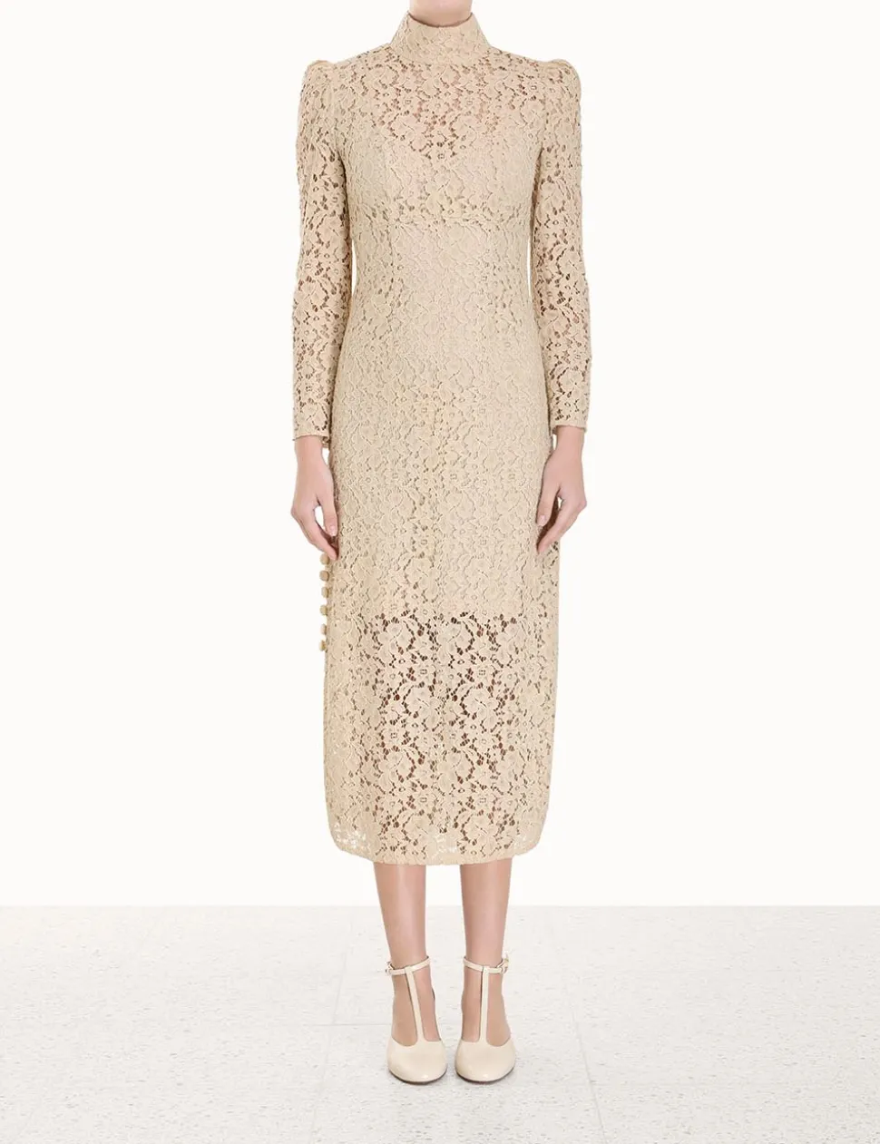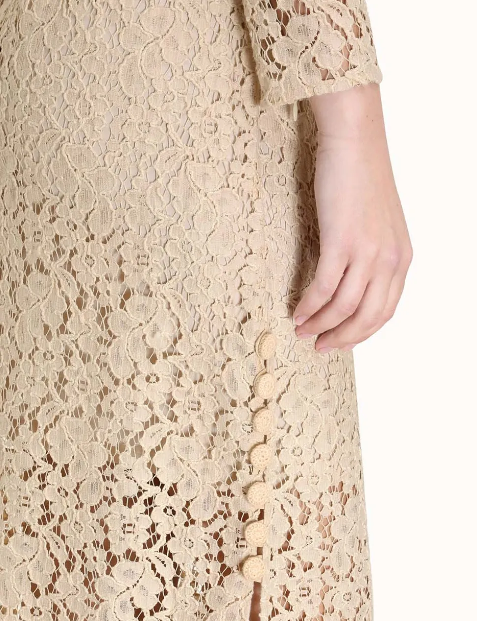 The Sensory Lace Midi Dress In Tea From Our Fall 2023 Collection, Luminosity. A Lace Midi Dress Featuring A Slim Silhouette And Buttoned Details Throughout.- Lace Midi Dress