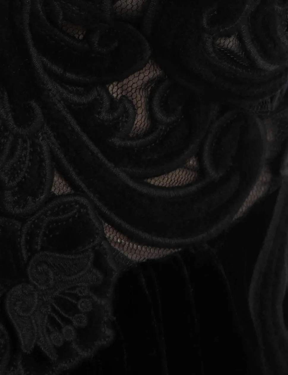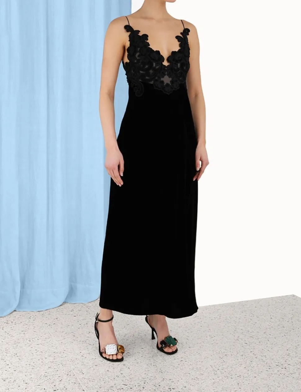 The Sensory Velvet Slip Dress In Black From Our Fall 2023 Collection, Luminosity. A Velvet Midi Dress Featuring A Contrast Bodice With Motifs Of Velvet Embroidery Throughout.- Velvet Midi Slip Dress