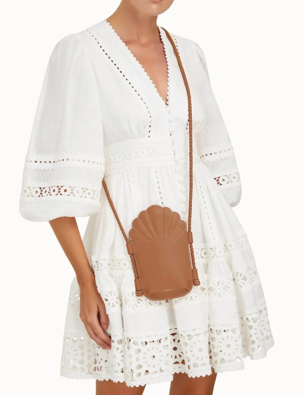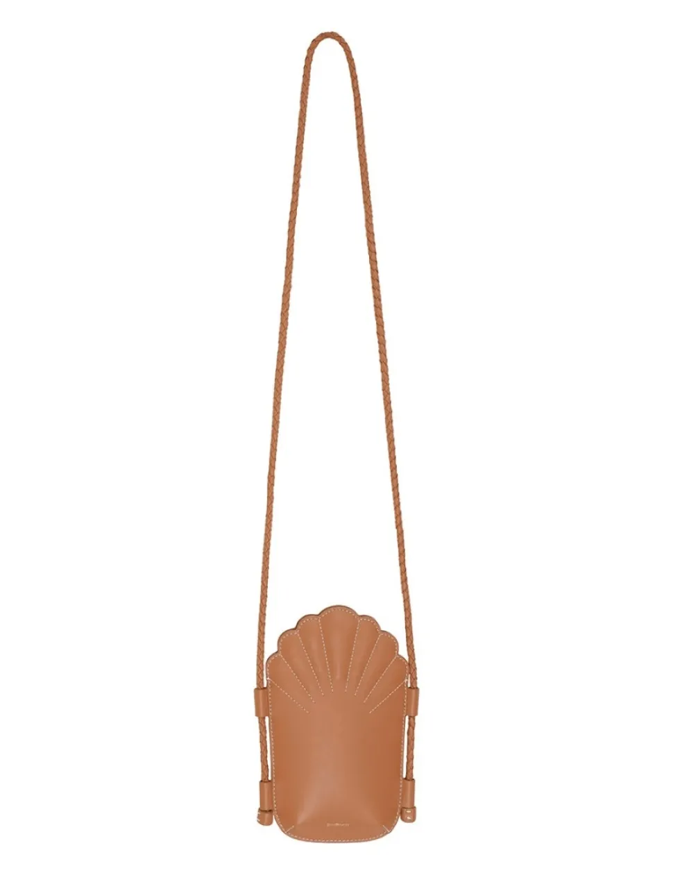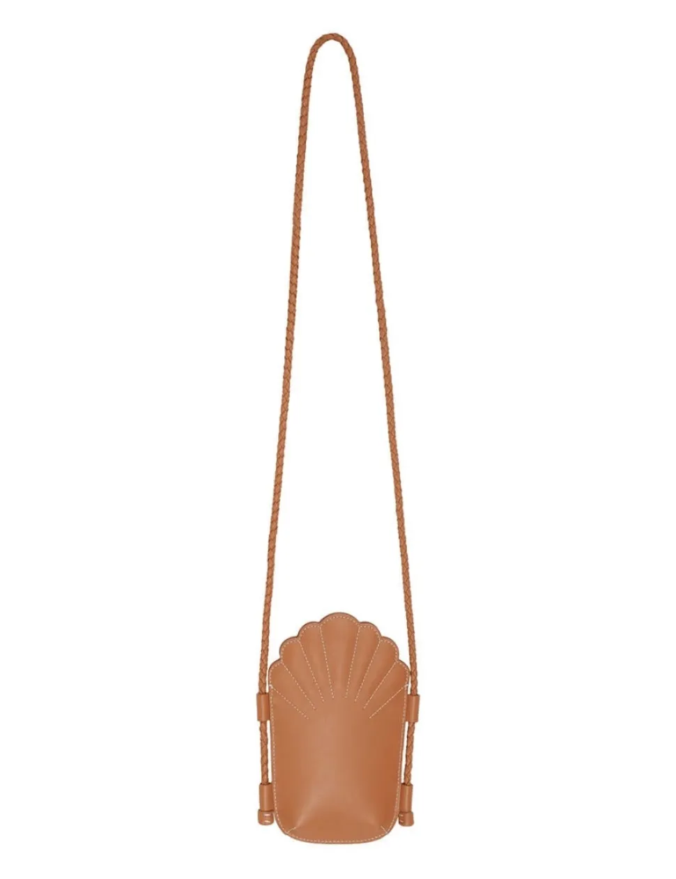The Shell Crossbody Bag In Tan From Our Summer Swim 2023 Collection. A Leather Cross Body Bag Featuring Shell Shaping And Contrast Topstitching Throughout.- Cross Body Bag