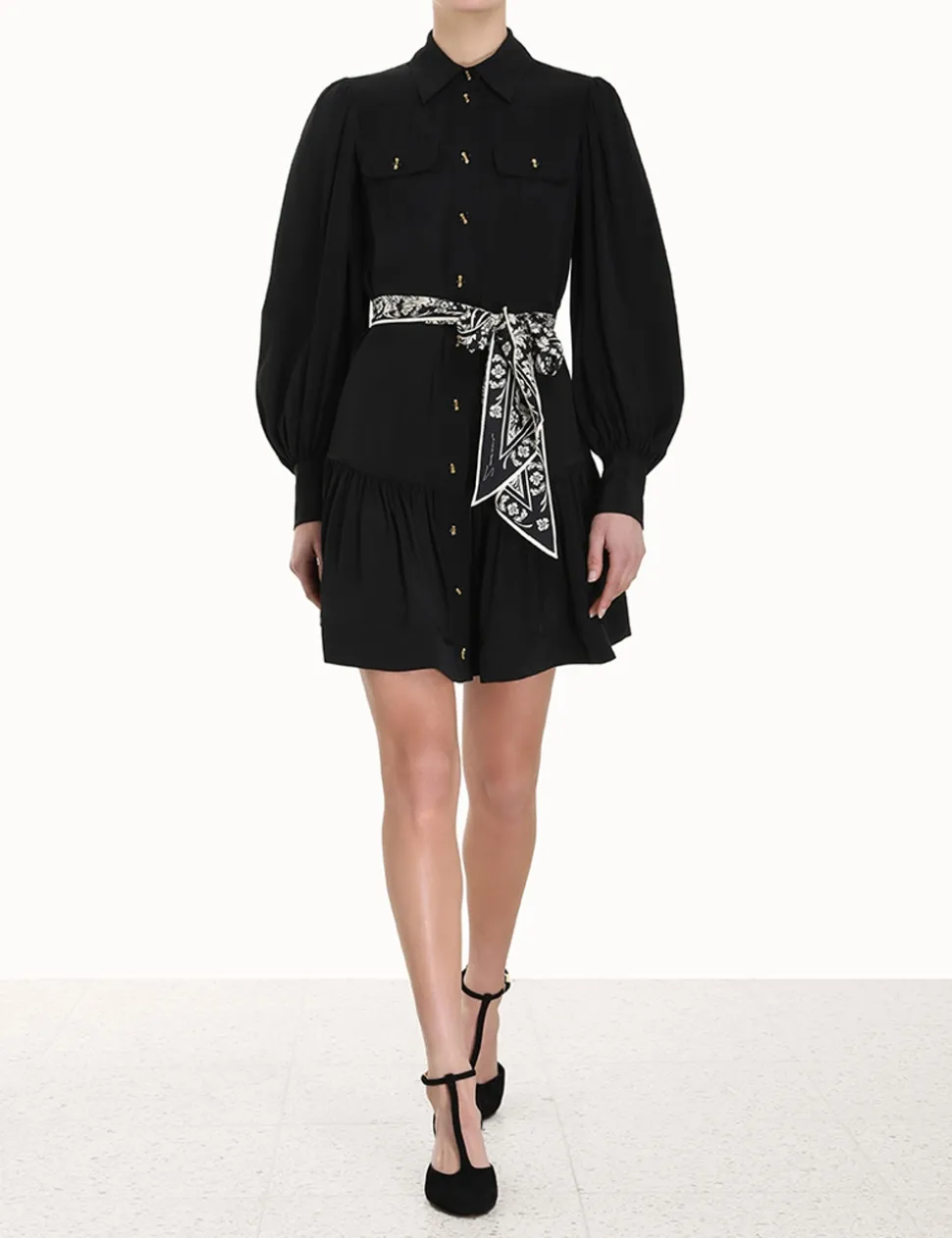 The Shirt Mini Dress In Black From Our Fall 2023 Collection, Luminosity. A Shirt Style Mini Dress Featuring Chest Patch Pockets, Blouson Sleeves And Contrast Binding Throughout.- Shirt Style Mini Dress