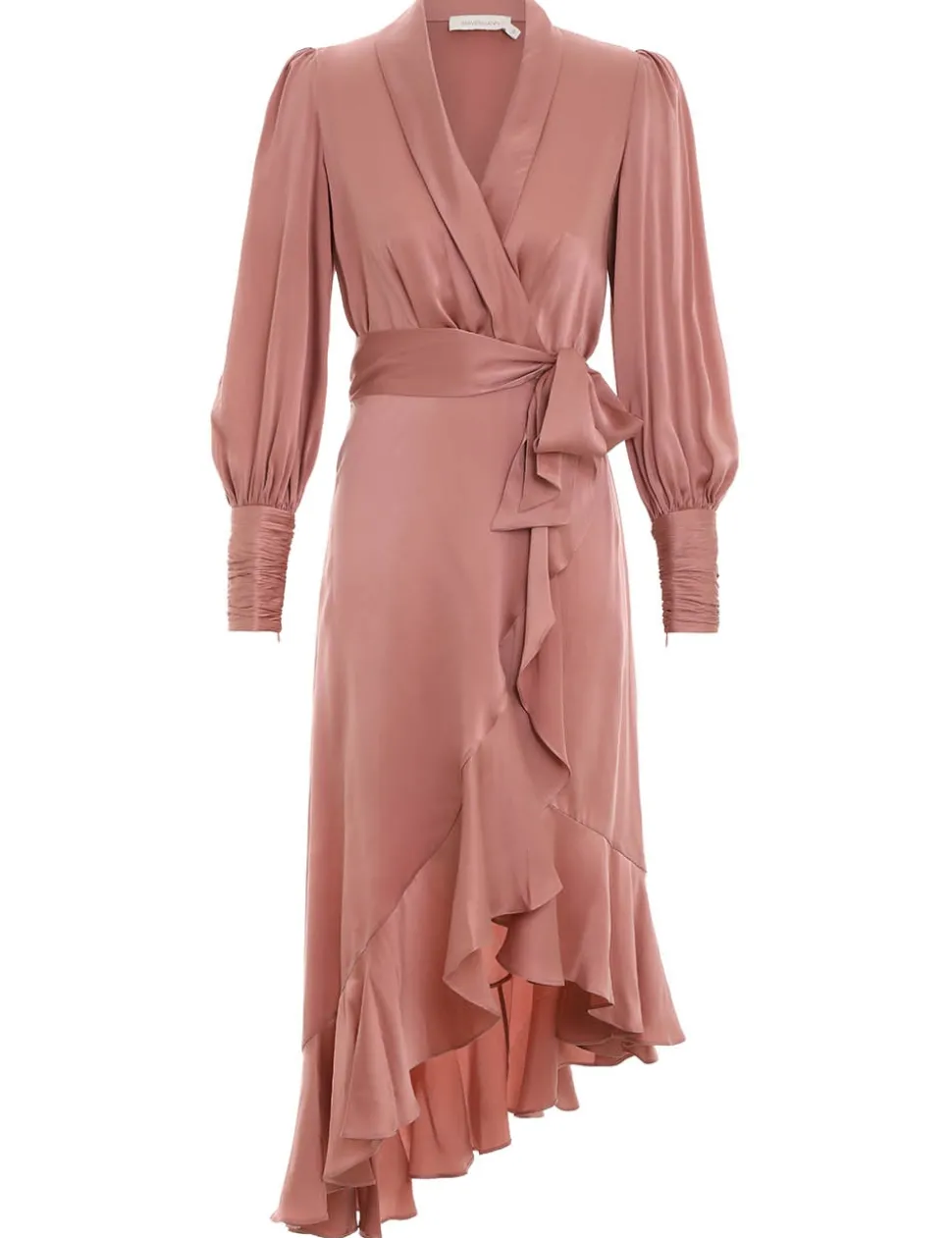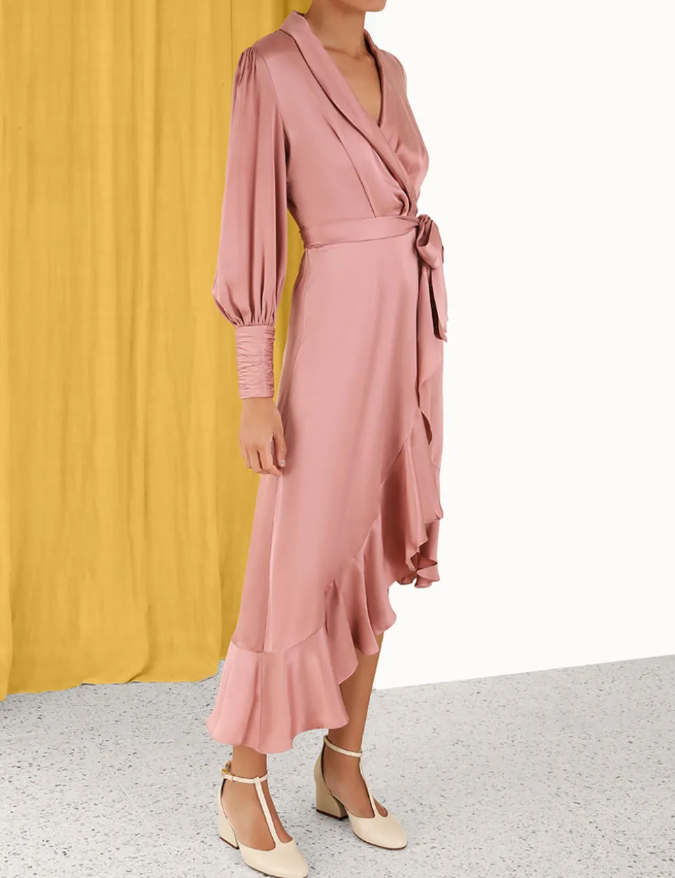 The Silk Wrap Midi Dress In Dusty Pink From Our Fall 2023 Collection, Luminosity. A Silk Midi Dress Featuring A Wrap Front Silhouette, Blouson Sleeves With Elongated Cuffs And Asymmetric Skirt.- Silk Midi Dress
