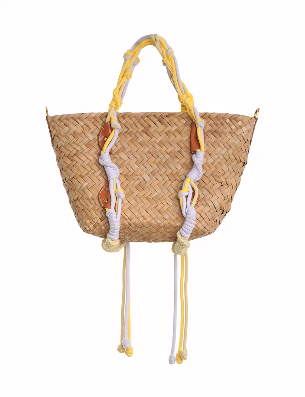 The Small Macrame Basket In Lilac Multi From Our Summer Swim 2023 Collection. A Small Straw Basket Featuring Handwoven Macrame Detail And Leather Trims, Finished With An Internal Pocket And Removable Shoulder Strap.- Large Straw Basket