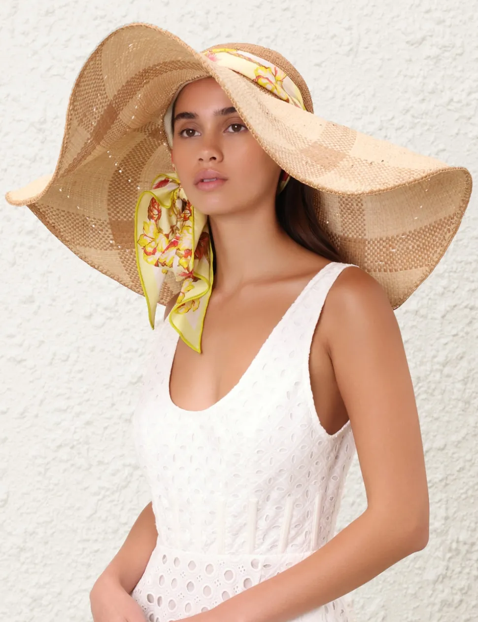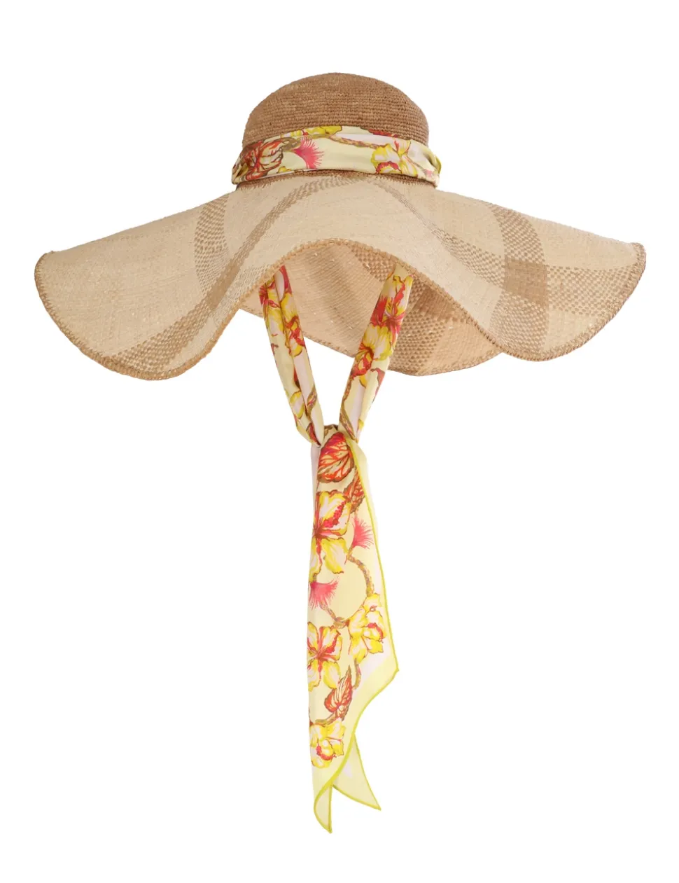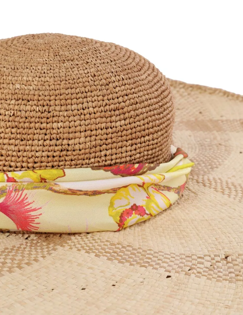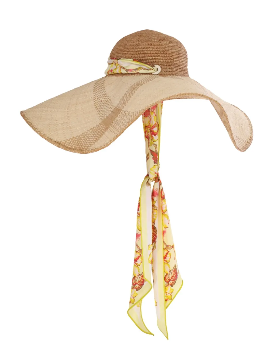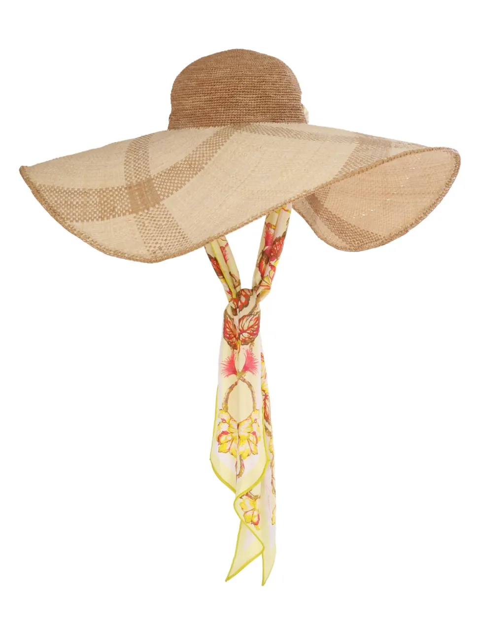 The Straw & Printed Silk Sunhat In Yellow Hibiscus From Our Resort 2024 Collection, Matchmaker. A Wide Brim Raffia Sun Hat Featuring Printed Silk Scarf.- Raffia Hat