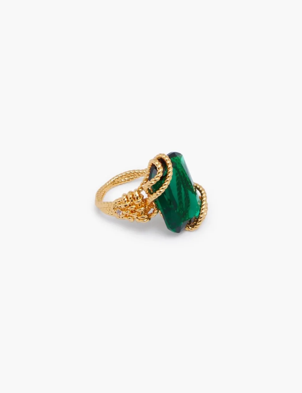 The Tangled Rope Cocktail Ring In Gold/Emerald From Our Spring 2023 Collection, Wonderland. A Gold Plated Ring Featuring A Statement Stone With An Intricate Cast Setting.- 20K Gold Plated