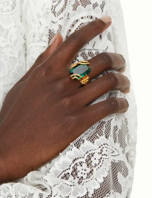 The Tangled Rope Cocktail Ring In Gold/Emerald From Our Spring 2023 Collection, Wonderland. A Gold Plated Ring Featuring A Statement Stone With An Intricate Cast Setting.- 20K Gold Plated