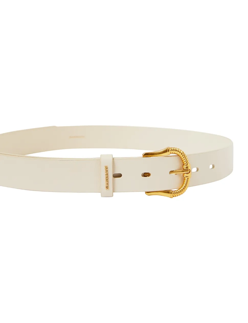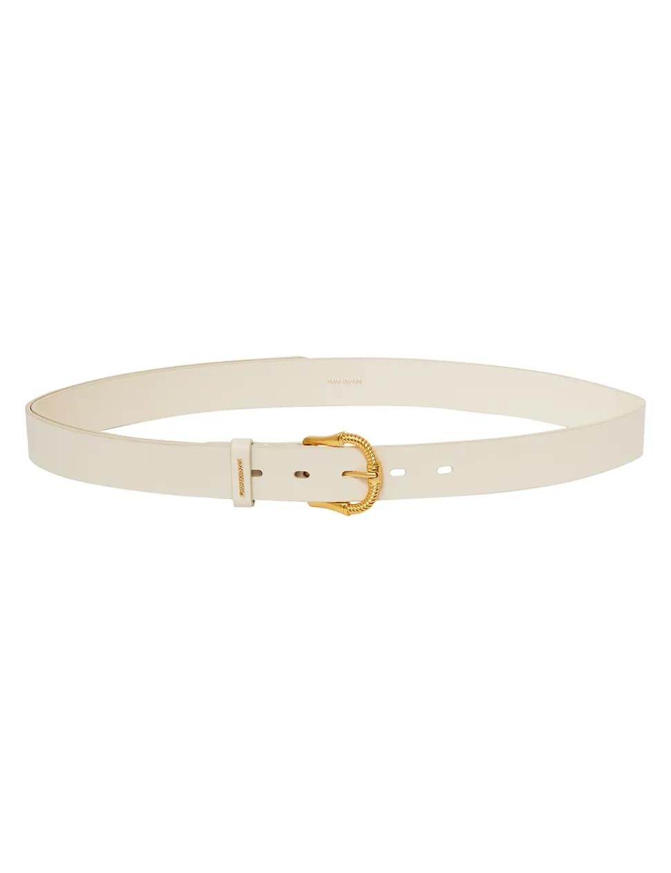 The Twisted Buckle Leather Belt 30 In Macadamia From Our Resort 2024 Collection, Matchmaker. A Leather Belt Featuring A Twisted Gold Buckle And Custom Branding.- Waist Belt