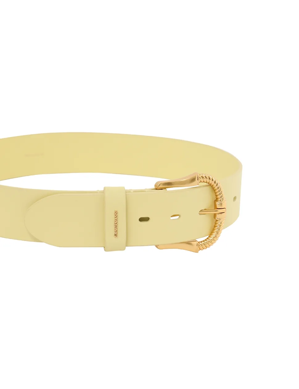 The Twisted Buckle Leather Belt 40 In Lemonade From Our Resort 2024 Collection, Matchmaker. A Leather Belt Featuring A Twisted Gold Buckle And Custom Branding.- Waist Belt