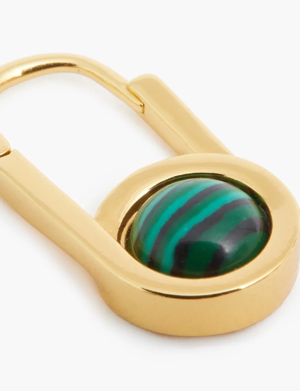 The Twisted Pin Earrings In Gold/Malachite From Our Spring 2023 Collection, Wonderland. A Gold Plated Pin Shape Earring Featuring Semi Precious Natural Stone.- 20K Gold Plated