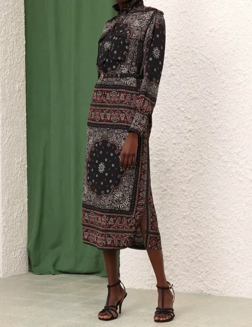 The Utility Midi Dress In Black Bandana From Our Resort 2024 Collection, Matchmaker. A Midi Dress Featuring A Utility Silhouette, Finished Long Sleeves And Thin Waist Belt.- Midi Dress