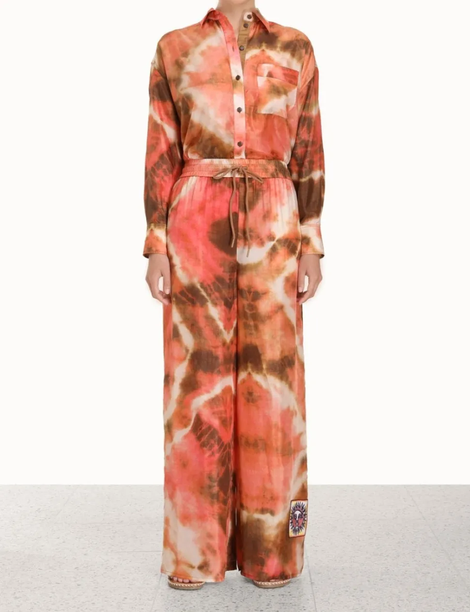 The Vacay Relaxed Pant In Red/Brown Tie Dye From Our Summer Swim 2023 Collection. A Silk Wide Leg Pant Featuring A Draw String Elasticated Waist Band.- Silk Pant