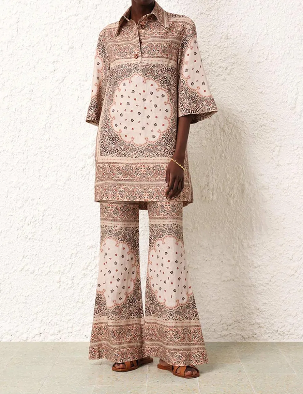 The Wide Leg Pant In Cream Bandana From Our Resort 2024 Collection, Matchmaker. A Linen Pant Featuring A High Waisted, Flare Silhouette, Finished With A Self Cover Belt.- Linen Pant